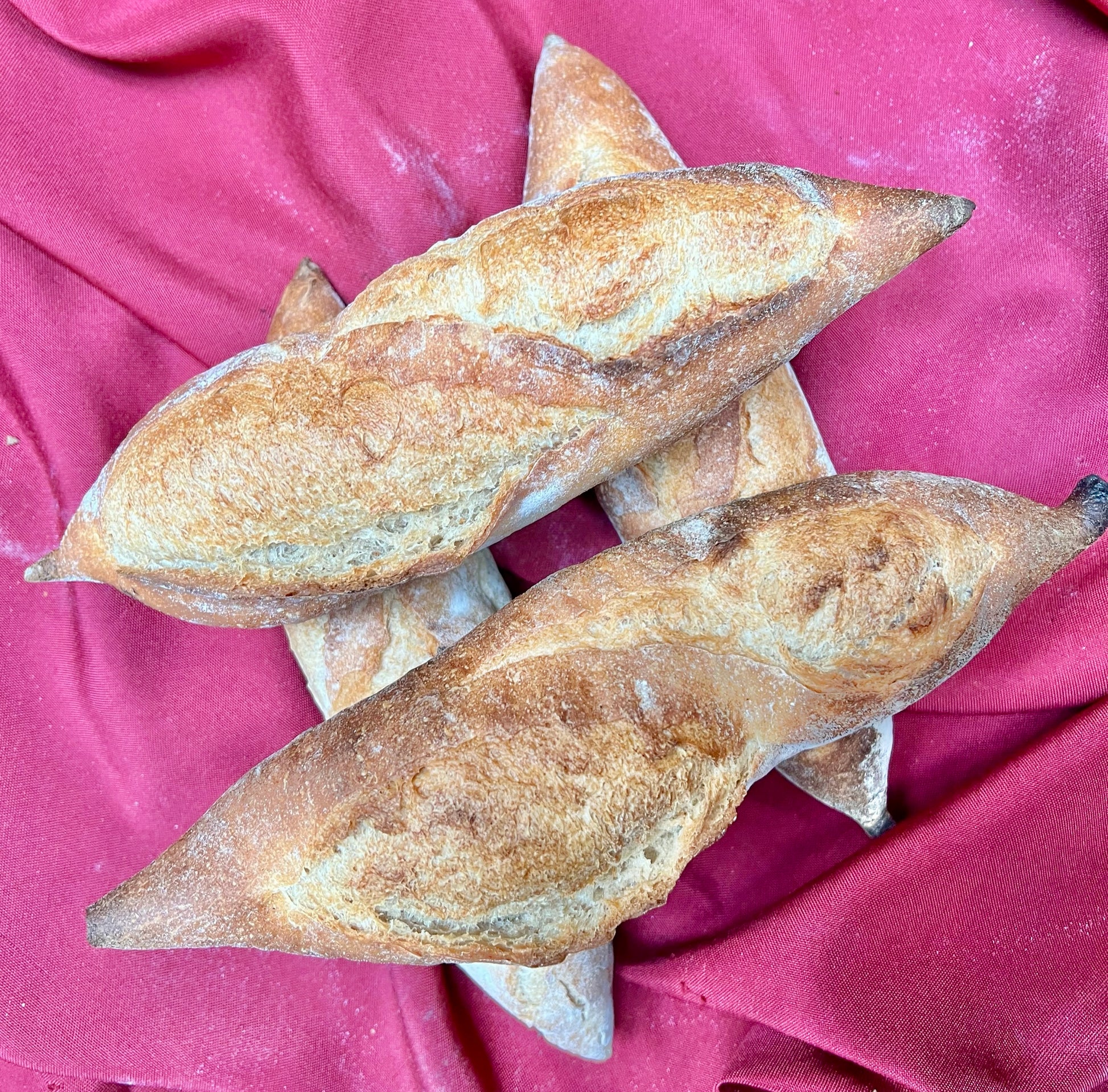 Two (2) fresh-baked sourdough mini-baguettes, weighing 200 grams each, of stone-ground whole grains from our friends at Publican Quality Breads.
